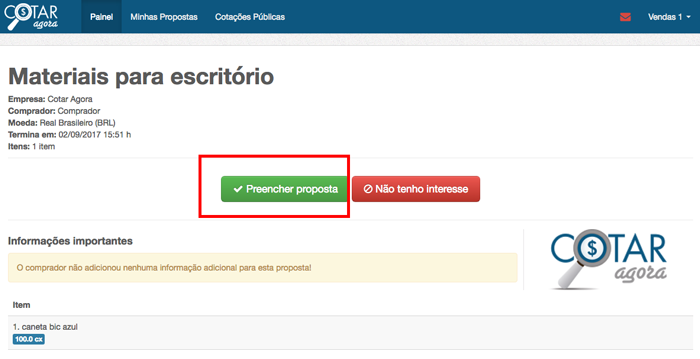 Pronto, agora basta selecionar em preencher proposta, e o próxima etapa é preencher os itens selecionados pelo comprador.